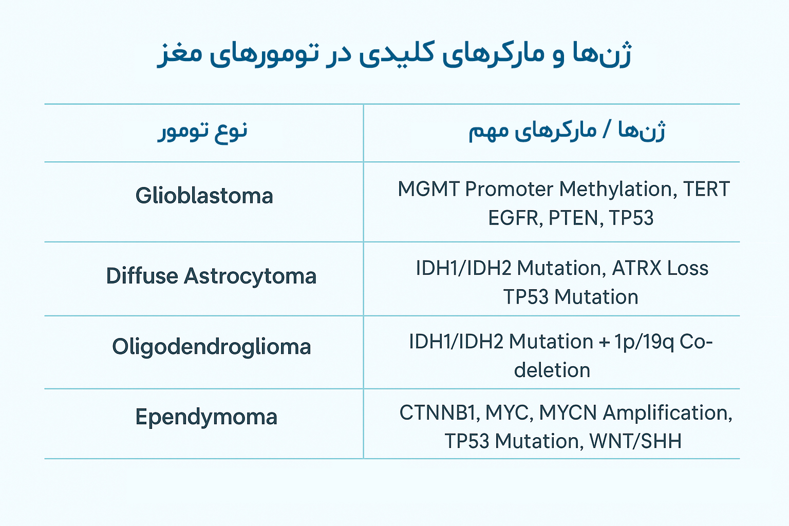در واقع، امروزه تشخیص بسیاری از تومورهای مغزی بدون بررسی ژنتیکی ناقص تلقی میشود. در جدول زیر، مهمترین تغییرات ژنتیکی مورد بررسی در تومورهای CNS آورده شده است: