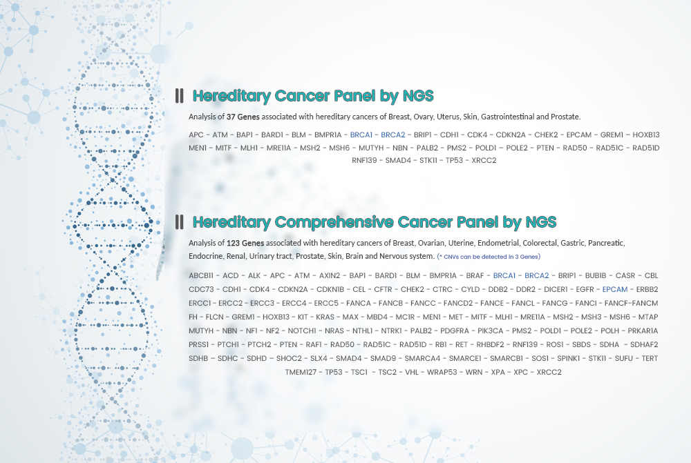 در آزمایشگاه پاتولوژی و ژنتیک کریمینژاد - نجمآبادی، مجموعه کامل پنلهای ژنتیکی مرتبط با سرطانهای ارثی شامل سرطانهای پستان، تخمدان، پروستات، کولورکتال، اندومتر، تیروئید، پانکراس، کلیه، پوست، غدد و تومورهای مغزی به کمک تکنولوژی توالییابی نسل جدید (Next-Generation Sequencing - NGS) بهصورت همزمان و با دقت بالا مورد بررسی قرار میگیرند.